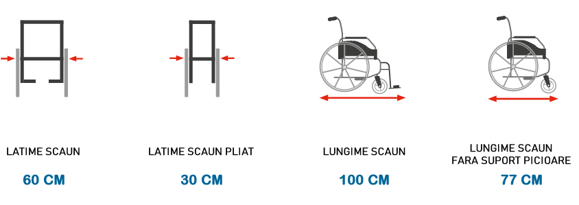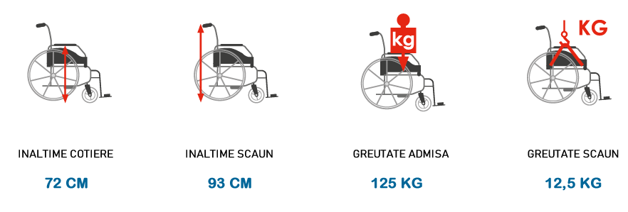 In 5 dimensiuni, cu roti spate pneumatice sau solide de 600 mm cu sistem de eliberare rapida pentru transport si depozitare usor. Optiuni roti de 300 mm (tranzit). Roti fata solide de 200 mm. Greutate maxima admisa: 125 kg.